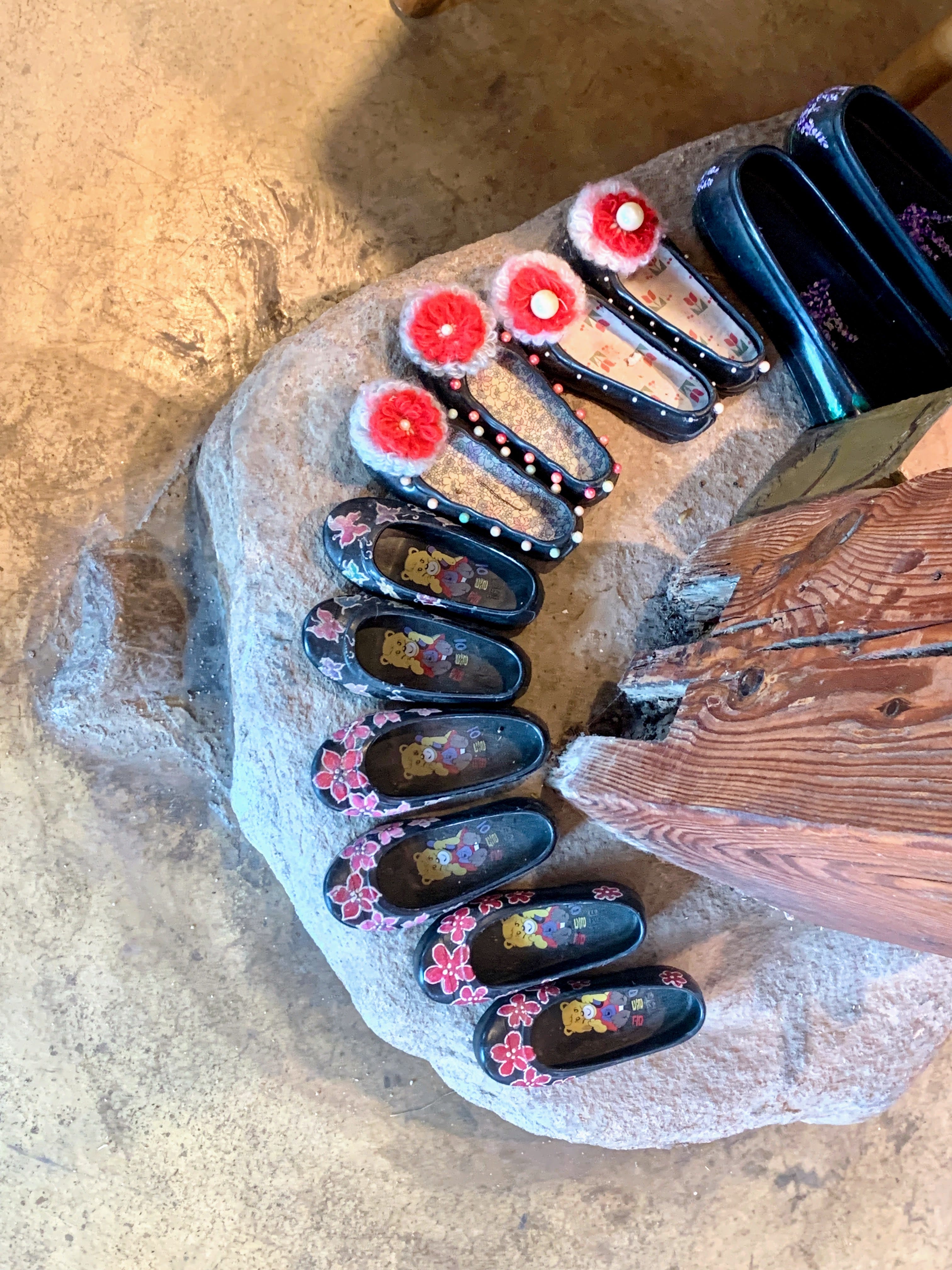 I’m in Korea for work. My boss and his group are invited to have Korean BBQ at a traditional restaurant. We’re told to leave our shoes on the step that leads to the private dining area and we’re given slippers to wear.